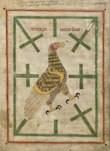 Afbeelding 23. Het symbool van Johannes is de adelaar, hier afgebeeld in groen en geel. De kenmerken zijn aanwezig, maar nog altijd is er geen realistische voorstelling. De kruizen zijn een teken van christelijke symboliek, maar stellen de windstreken voor. Het christelijk geloof wordt naar alle windstreken uitgedragen en verspreid.