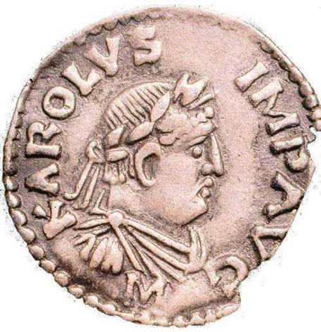 In 800 wordt Karel de Grote in Rome tot keizer gekroond. Het idee van een groot Keizerrijk herleeft. In deze munt wordt Karel de Grote afgebeeld als Romeins Imperator. De randtekst luidt ook KAROLUS IMP(ERATOR) AUG(USTUS). Karel neemt hiermee naar zijn onderdanen de titel aan van Augustus, naar de eerste keizer van Rome. Hij is ook afgebeeld met de laurierkroon en zijn overkleed wordt op de schouder bijeengehouden door een fibula. Hij ziet er op deze munt uit als een Romeinse Senator op weg naar het Senaatsgebouw. De munten dienden als een vorm van public relations. Iedereen kreeg ze in handen en kon kennis nemen van de persoon Karel de Grote.