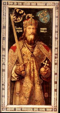 Op dit schilderij van de Duitse renaissance schilder Albrecht Dürer is Karel de Grote ook afgebeeld met de regalia. De wapenschilden links en recht symboliseren zijn afkomst van de Frankische koningen (rechts de fleur de lis) en links staat de adelaar van het Heilige Römische Reich der Deutsche Nation.
