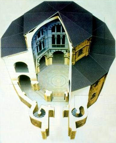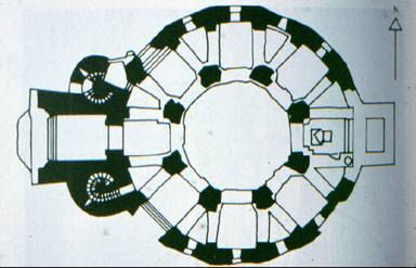 Van dit complex is alleen de octogonale kerk (rechts in de tekening) nog aanwezig. Aan de westzijde van de kerk is een groot atrium en het koor in het oosten in een kleine uitbouwtje.