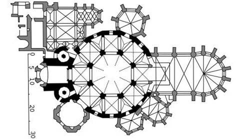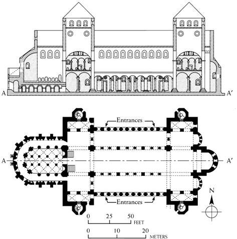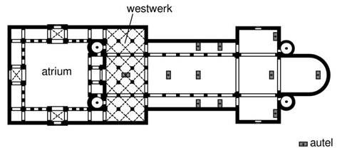 Het westwerk is een gespiegeld kopie van het transcept. Op deze longitudinale tekening van de kerk is duidelijk te zien dat ook de torens van het transcept zijn gekopieerd naar het Westwerk. Bekijken we het grondplan dan is het transcept als het ware over het Westwerk te leggen en zijn beide delen van de kerk identiek.