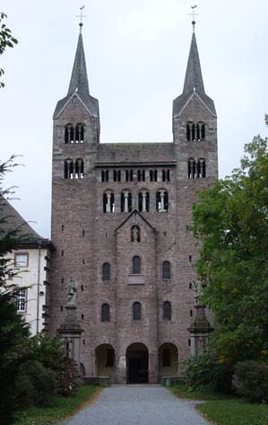 Op deze afbeelding is duidelijk te zien dat het Westwerk een eigen gebouw is. De middelste toegang staat in het midden-risaliet. Twee toren flankeren de zijkanten.