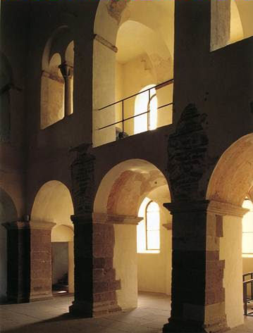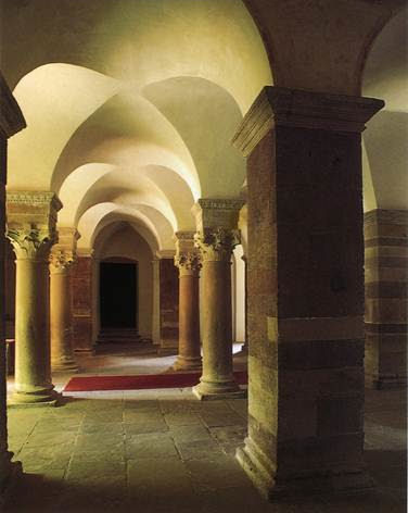 De Karolingische tribune in het westwerk van Corvey kent rondbogen en tongewelven. Daar waar tongewelven samenkomen ontstaat een zogenaamd kruisgewelf. Vanaf het hoogste punt in het kruisgewelf wordt de druk van het gebouw over de ribben afgevoerd naar de pilaren.